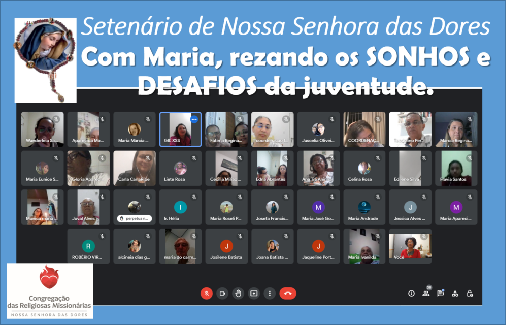 O Setenário de Nossa Senhora das Dores tem como tema Com Maria, rezando os SONHOS e DESAFIOS da juventude. E na noite de ontem, como família RMNSD, nos reunimos para rezar a 1ª Dor.  Ao rezar a Profecia de Simeão à Maria, contemplamos em nossa realidade uma juventude que quer ser acompanhado em seu Sonho.  E nesse momento da história, Deus confirma para nós, Congregação das Religiosas Missionárias de Nossa Senhora das Dores, o nosso compromisso com a Juventude Crucificada.