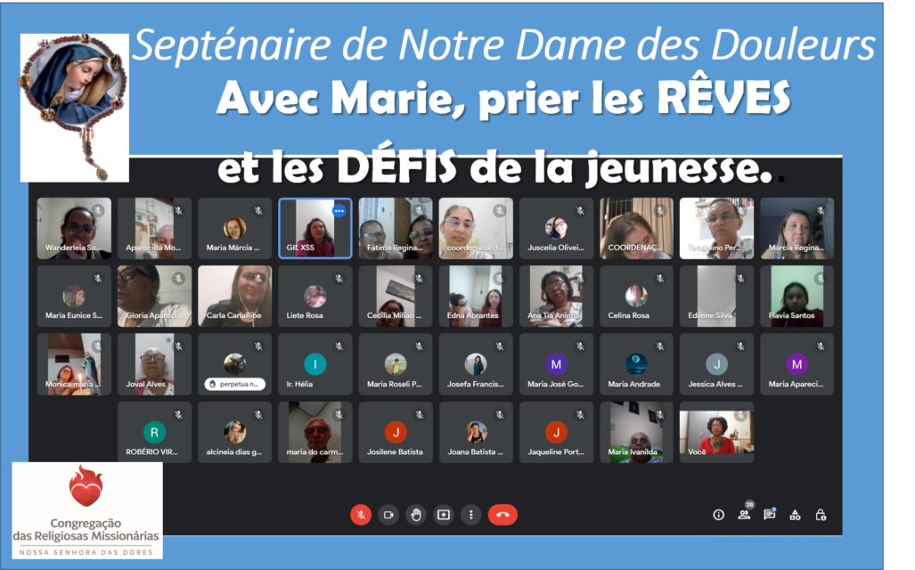 El Septénaire de Notre Dame des Douleurs a pour thème Avec Marie, prier les RÊVES et les DÉFIS de la jeunesse. Et hier soir, en tant que famille MNDD, nous nous sommes réunis pour prier la 1ʳᵉ douleur. En priant la prophétie de Siméon à Marie, nous avons contemplé dans notre réalité un jeune qui veut être accompagné dans son Rêve. Et en ce moment de l’histoire, Dieu confirme pour nous, la Congrégation des Religieuses Missionnaires de Notre Dame des Douleurs, notre engagement envers la Jeunesse Crucifiée.